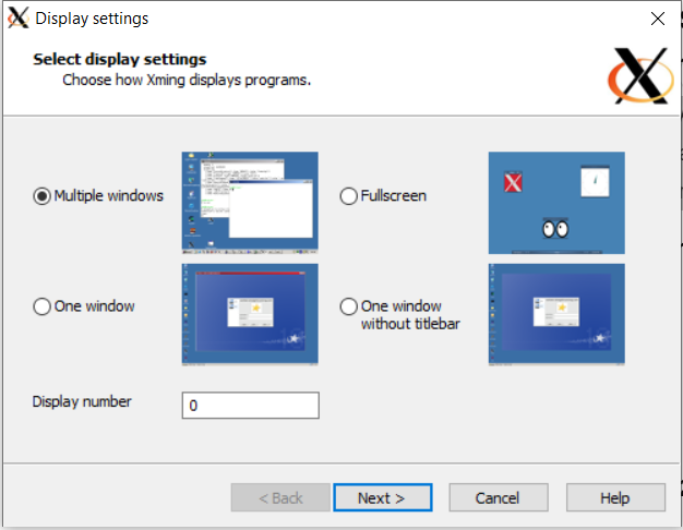 - During setup in Xlaunch (installed VcXsrv), I chose Multiple Windows mode and set the display num to 0 (you can also set it to 1 or some other number, but it is not possible to set it to -1 in vcxsrv-64.1.20.14.0 since the GUI only accept number input in Display number field)